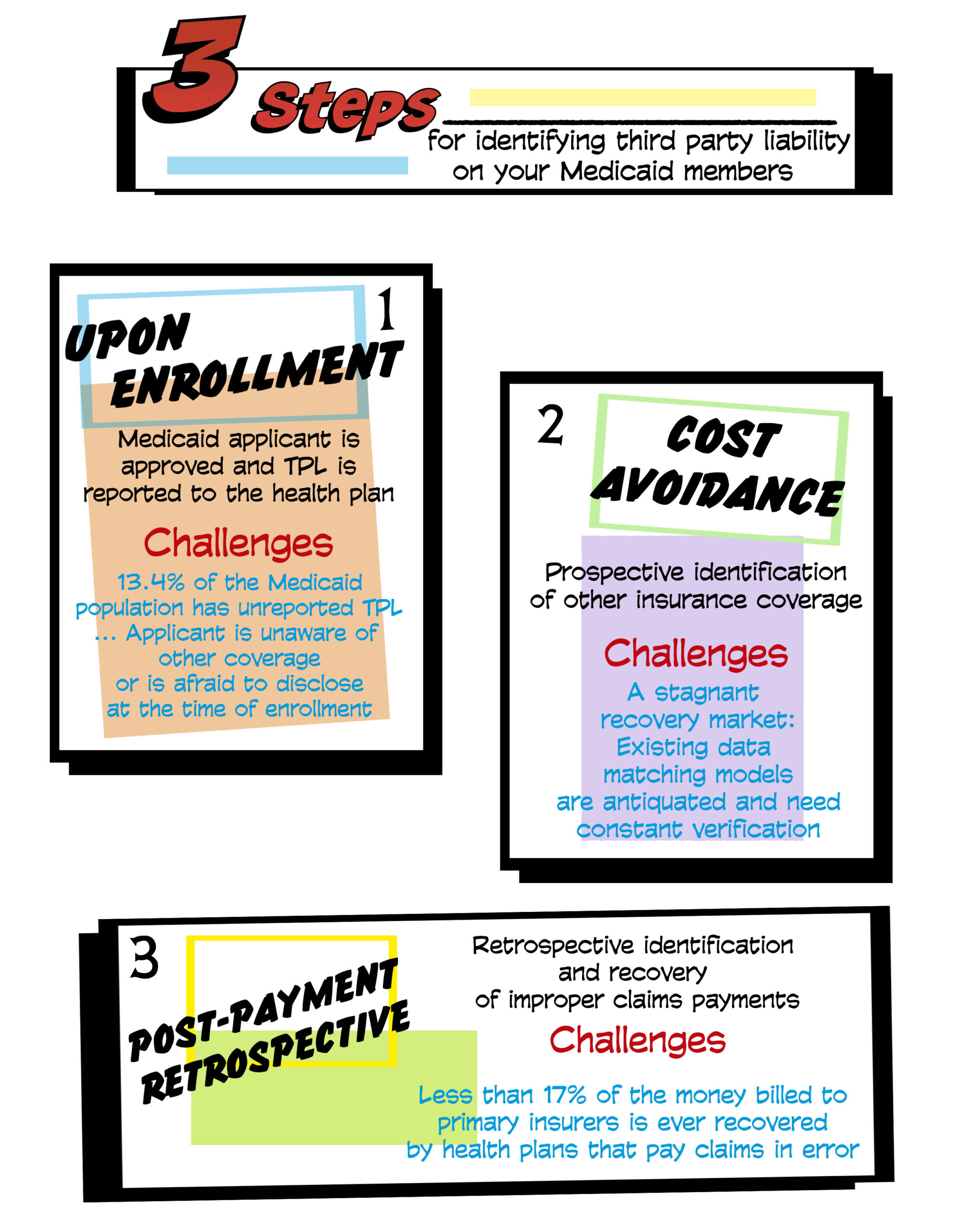 The discovery of liable third parties occurs at three points in the lifecycle of a Medicaid member. This discovery of unknown primary insurance coverage may occur during the enrollment process, prospectively before claims are paid, and retrospectively after an improper claims payment has been made (pay and chase).
